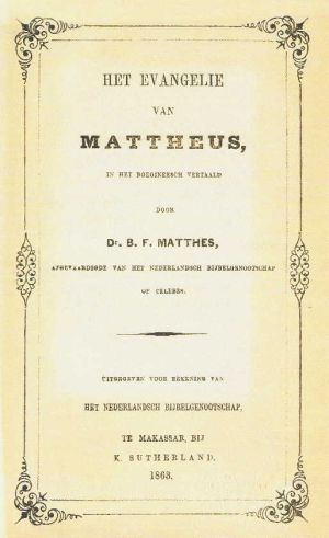 B.F. Matthes (16 Januari 1818 - 9 Oktober 1908) adalah anak pendeta H.J. Matthes. Pada tahun 1835 ia mencatatkan diri sebagai mahasiswa sastra dan theologia di Leiden. Kira-kira setahun kemudian (1836) ia telah lulus ujian-kandidat (sastra) dengan pujian. Dari tahun 1838-1841 ia belajar di Seminari Lutheran di Amsterdam. Pada tanggal 1 September 1841 ia ditahbis sebagai pendeta (dari Gereja Lutheran Injili). Dari tahun 1841-1848 ia bekerja di Rotterdam sebagai wakil-direktor dari N.Z.G. Setahun sebelum itu (1847) ia diangkat oleh Lembaga Alkitab Belanda sebagai "wakilnya" di Sulawesi-Selatan untuk mempelajari bahasa (Makasar dan Bugis) di situ dan untuk menterjemahkan Kitab Suci dalam bahasa-bahasa itu. Sesudah memperoleh doctor honoris causa (Sastra) di Leiden, ia kawin dengan nona C.N. Engelenburg (17 Juli 1848). Segera sesudah itu (permulaan Juli 1848A) ia dan isterinya berangkat ke Indonesia.
